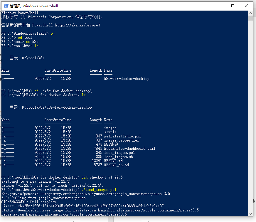 所以此处我切换到了1.22.5的版本,然后执行其中的脚本,在powershell中输入