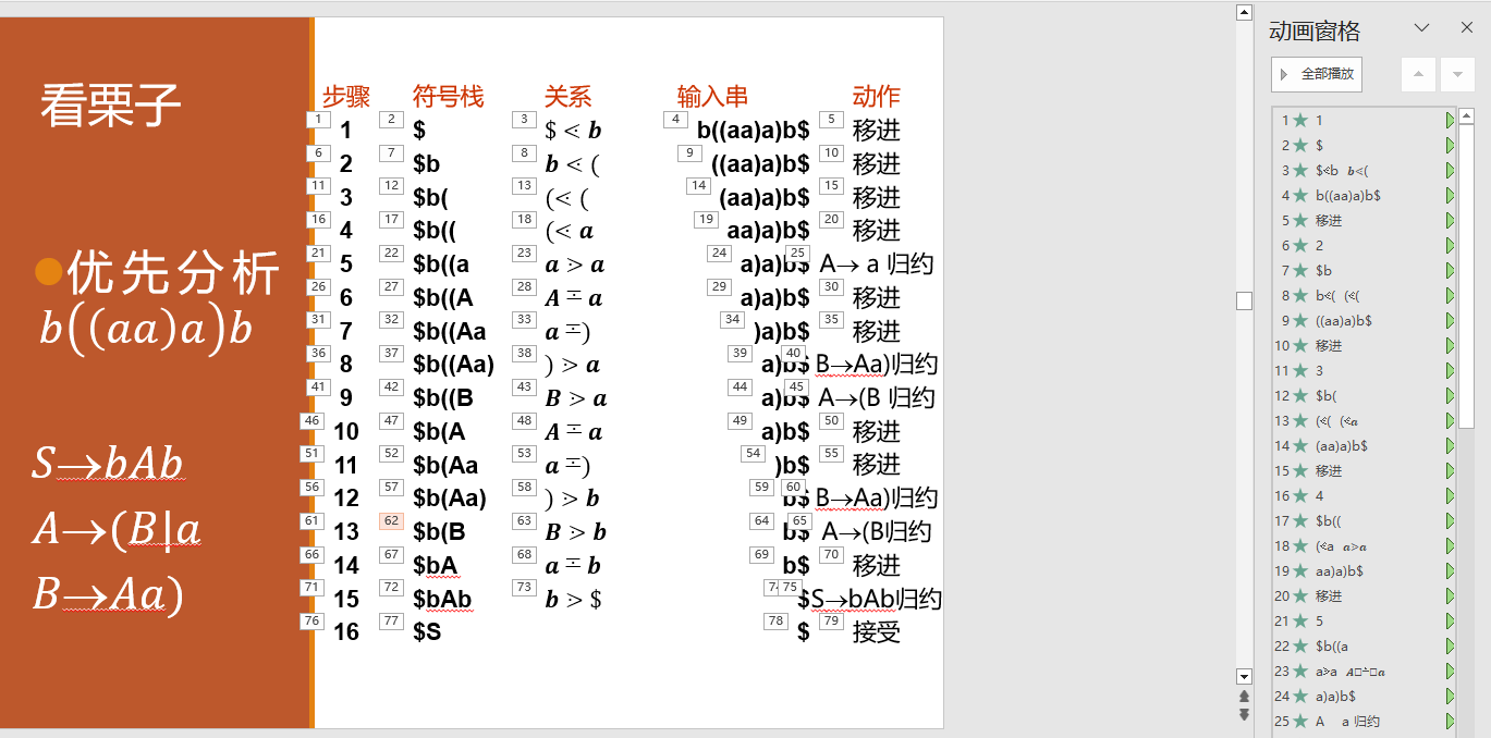 简单来讲, 就是把表格的内容先转到文本框里面, 然后用分栏, 最后再设置动画, 这样就能每一行分别出动画了.最后在动画窗格里面调整顺序即可.
