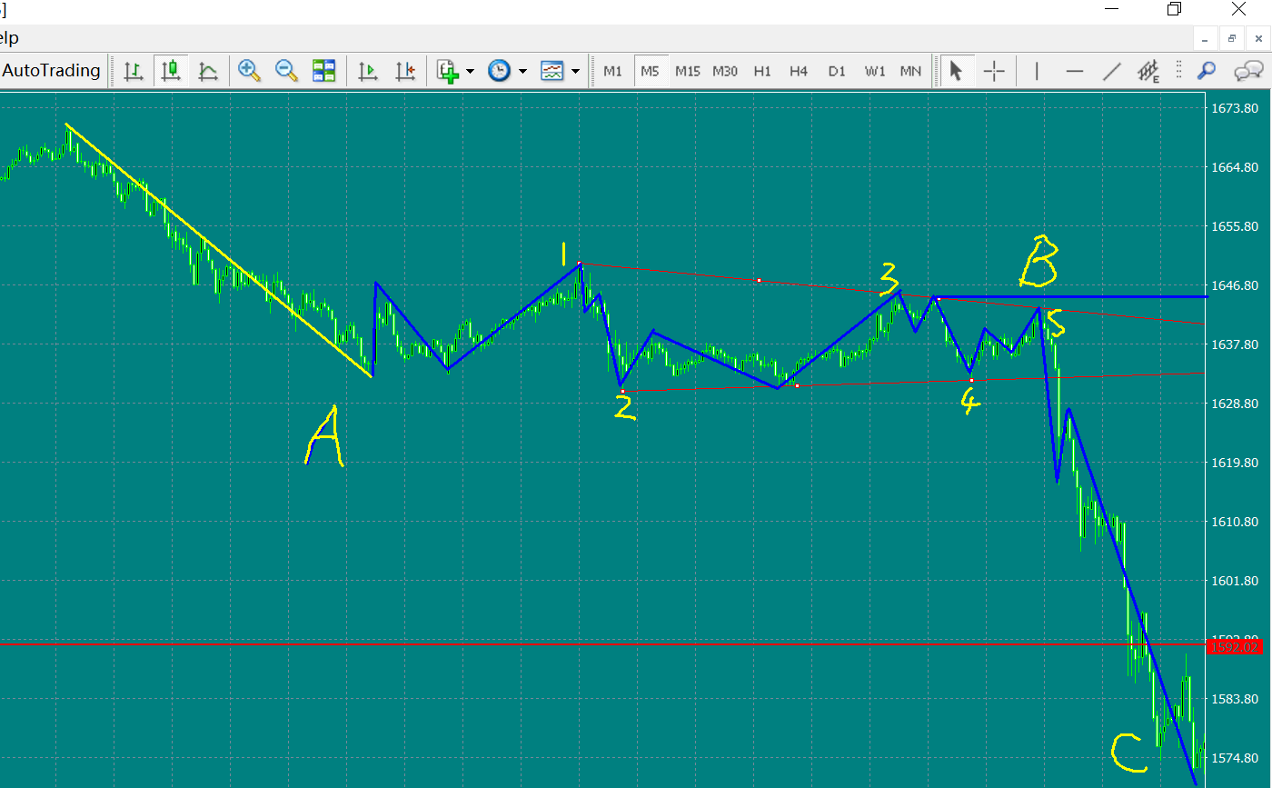 1. 这种形态出现在某3浪或5浪延长 或者某C浪。如果在15分钟以上级别出现,形态成立后通常至少就是50美金的行情。