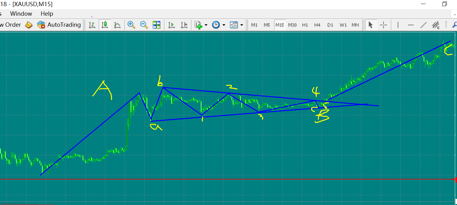 做单根据就是强势三角形研判。 三角形小2浪底如果破了A浪的底 我们叫它顺势或者说强势三角形,代表之前的趋势(A浪的趋势)非常强,三角形内5小波全部是3波结构,昨晚的黄金就是这样,很清晰。