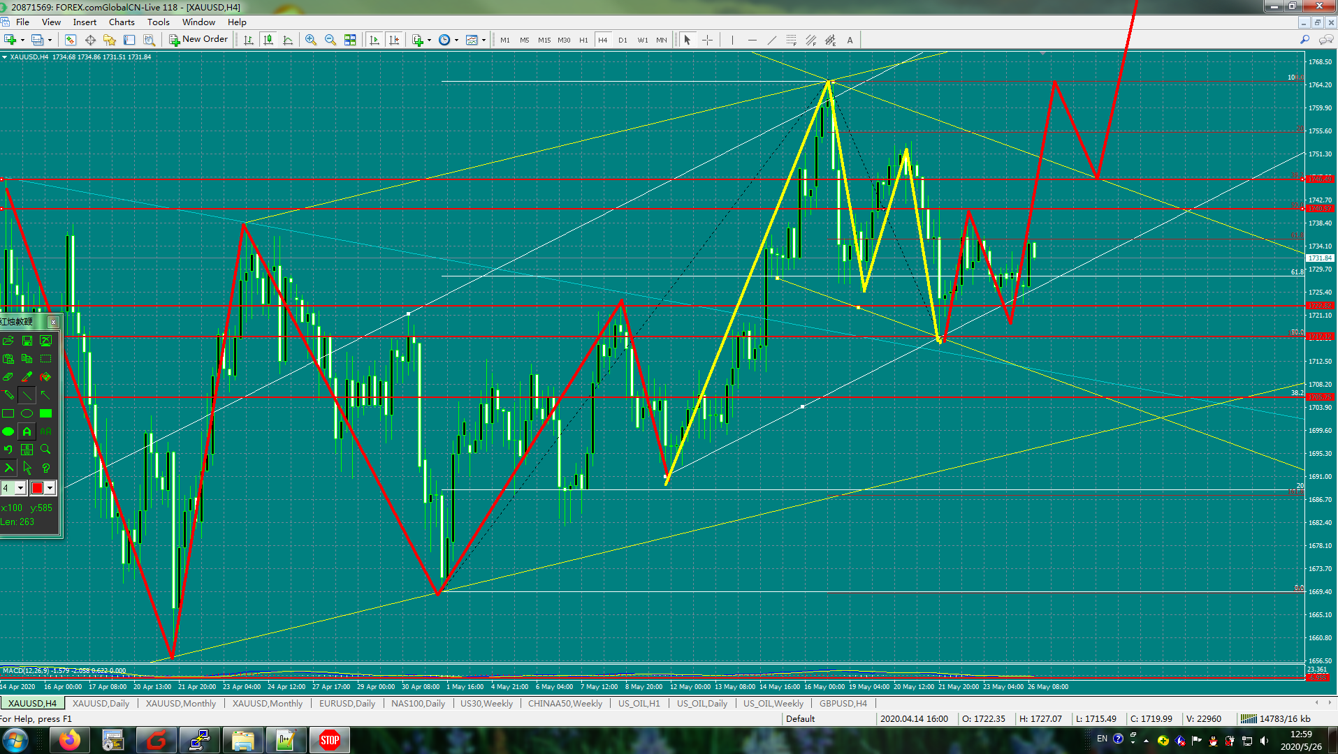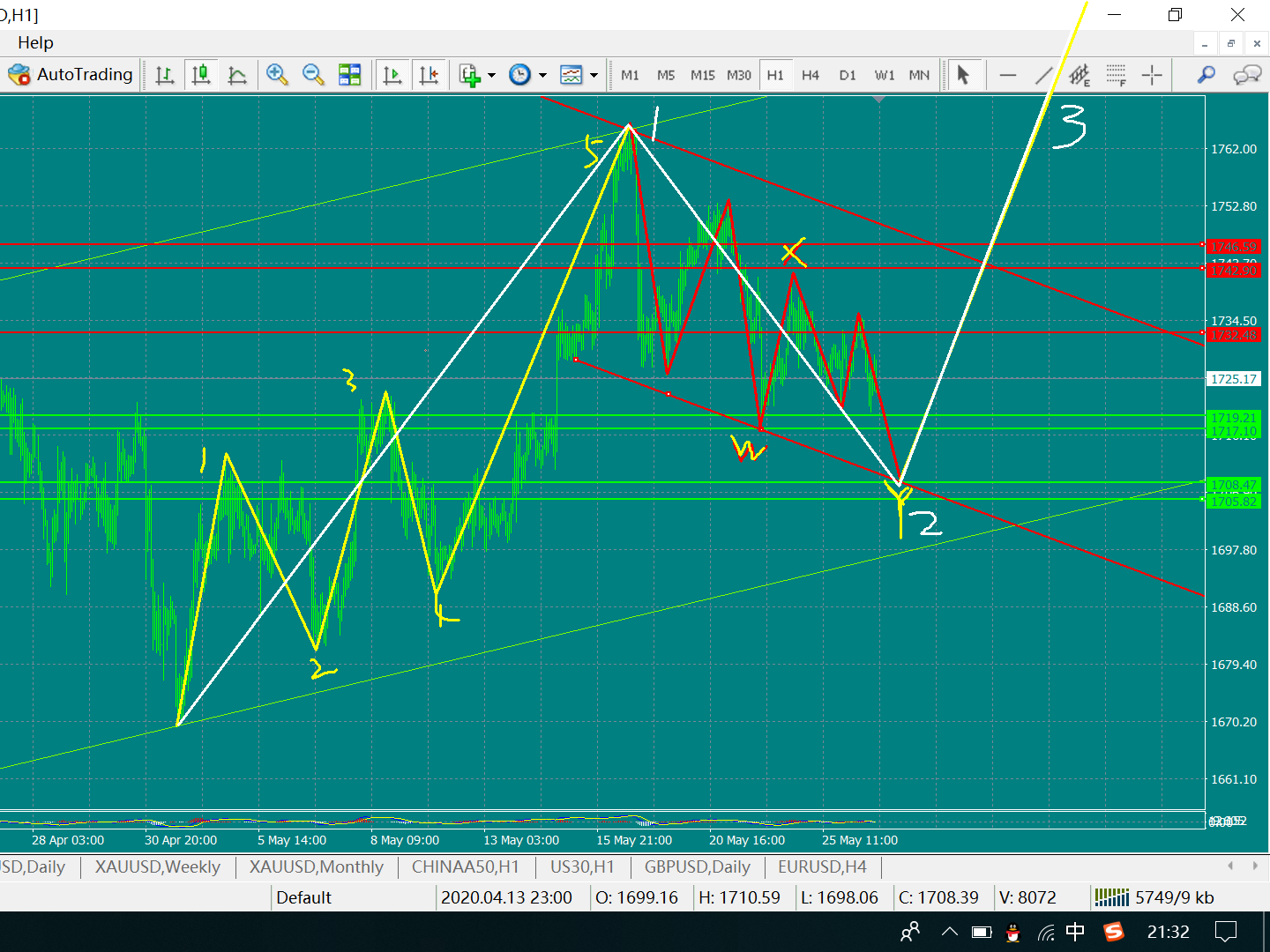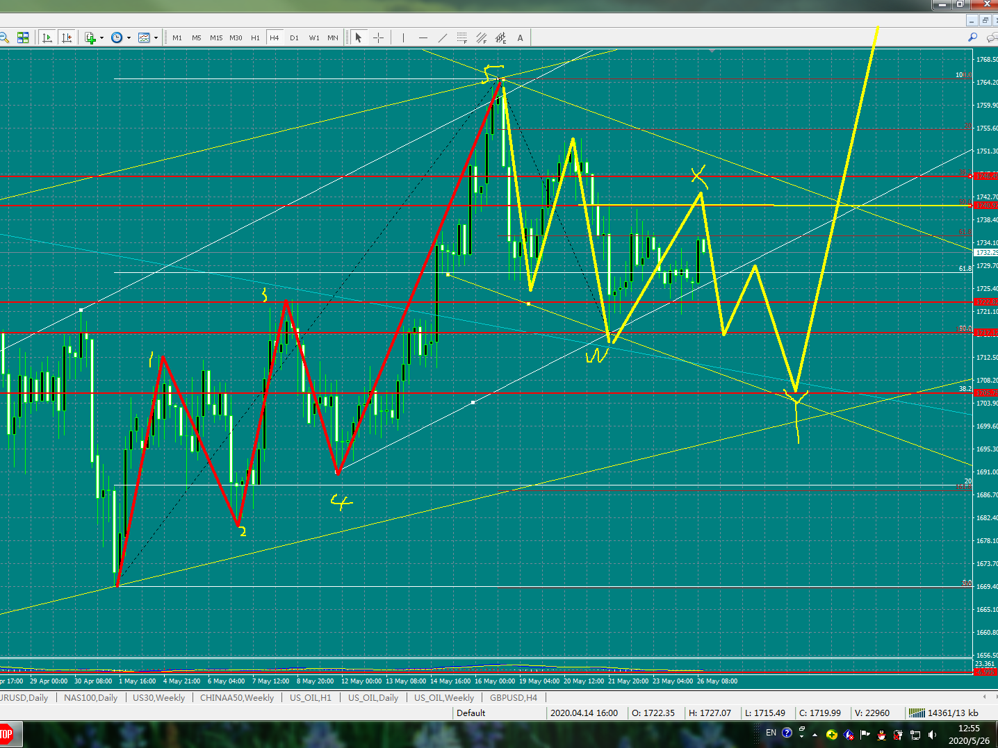26日 21:30更新 黄金跌破了方案一的上升趋势线 考虑反弹放空1732