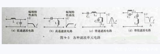 - 对于图9—3(c)所示的滤波电路,它利用C l和L1串联对谐振信号阻抗小、C2和L7并联对谐振信号阻抗大的特性,能让谐振信号f容易通过,而阻碍其他频率信号通过,所以称为带通滤波电路。该电路的这种特点可用图中的幅一频(U-F特性曲线概括