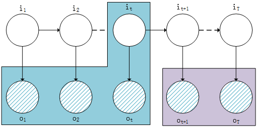 概率计算问题:给定模型参数\(\lambda=(\pi, A, B)\)和观测序列\(O=\left(o_{1}, o_{2}, \ldots, o_{T}\right)\),其中\(\pi\)为初始转移概率,\(A\)为转移矩阵,\(B\)为观测矩阵,计算在模型在\(\lambda\)下观测序列\(O\)出现的概率\(P (O∣\lambda)\) (前后向算法)