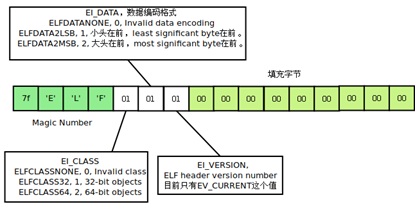第六个字节标识该ELF文件字节序是小端(01)还是大端(02)的。