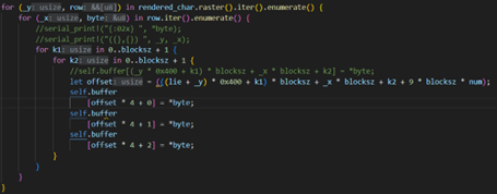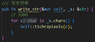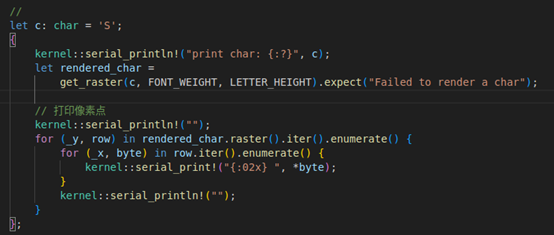 实现过程就相对简单了,我们需要将输入的字符通过get_raster()操作之后转换为RasterizedChar格式,遍历相应的像素点在buffer上的位置,将相应的内容输出到FrameBuffer的屏幕上(对应修改相应的buffer位置即可)。需要注意的是,我们将引用noto_sans_mono_bitmap中的方法的过程中需要的相应变量定义放在了整个方法实现的外面(并非方法私有)。