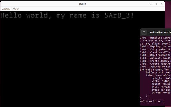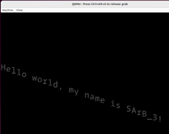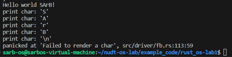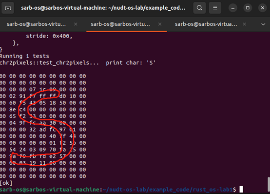 下面是将在test/下原有的chr2pixels移植到kernel/src/fb.rs中,为了方便区分,在fb.rs中的函数我们称其为t1chr2pixels。进行传参、调用等操作处理之后,我们第一步的测试结果如下所示: