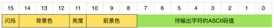 做个记录,在文本模式下,每个元素被称作字符单元,占显存两个字节大小,每个单元中的低8位表示字符的ASCII编码,高8位定义了字符的显示方式(字体,颜色,亮度,背景色,闪烁),如下图所示: