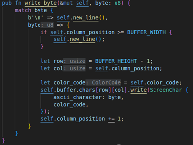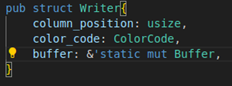 首先是Writer中各个数据成员的作用,在该结构体中共包含usize, ColorCode, Buffer,或许我们称呼其类型更加容易理解:column_position, color_code, buffer。