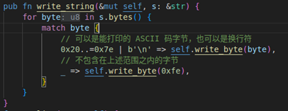 如果这个字节是一个换行符(line feed)字节 \n,我们的 Writer 不应该打印新字符,相反,它将调用 new_line ;其它的字节应该将在 match 语句的第二个分支中被打印到屏幕上。