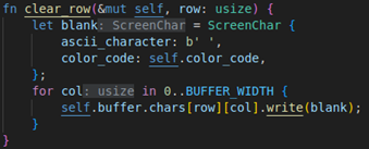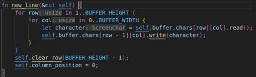 当打印字节时,Writer 将检查当前行是否已满。如果已满,它将首先调用 new_line 方法来将这一行字向上提升,再将一个新的 ScreenChar 写入到缓冲区,最终将当前的光标位置前进一位。