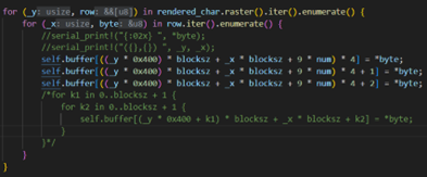 此外我们实现了字符放大的功能,即记录相对应的blocksz,将原本1x1的像素扩展到3x3的像素,这是正方形的扩展,实现代码如下(须注意,当我们扩展成了3x3之后,原有的偏移offset的计算方式也会有所改变,这里为了方便我们就把这个过程提取出来了):