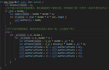 建立new_line有两种情况:对于还没写满/窗口已经写满了:对于窗口还没有写满的情况,我们直接清空下面的内容,列号移到下面一行即可(其实不清空也可以);对于已经写满的情况,将现在的内容向上移动一格,之后再向下写入。在实现过程中,我们采用了offset的方式来方便编写。