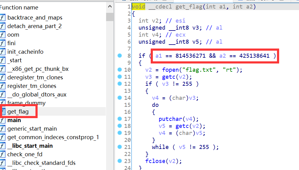 'a'*offset + 'ebp' + get_flag + get_flag的返回地址 + 参数a1 + 参数a2
