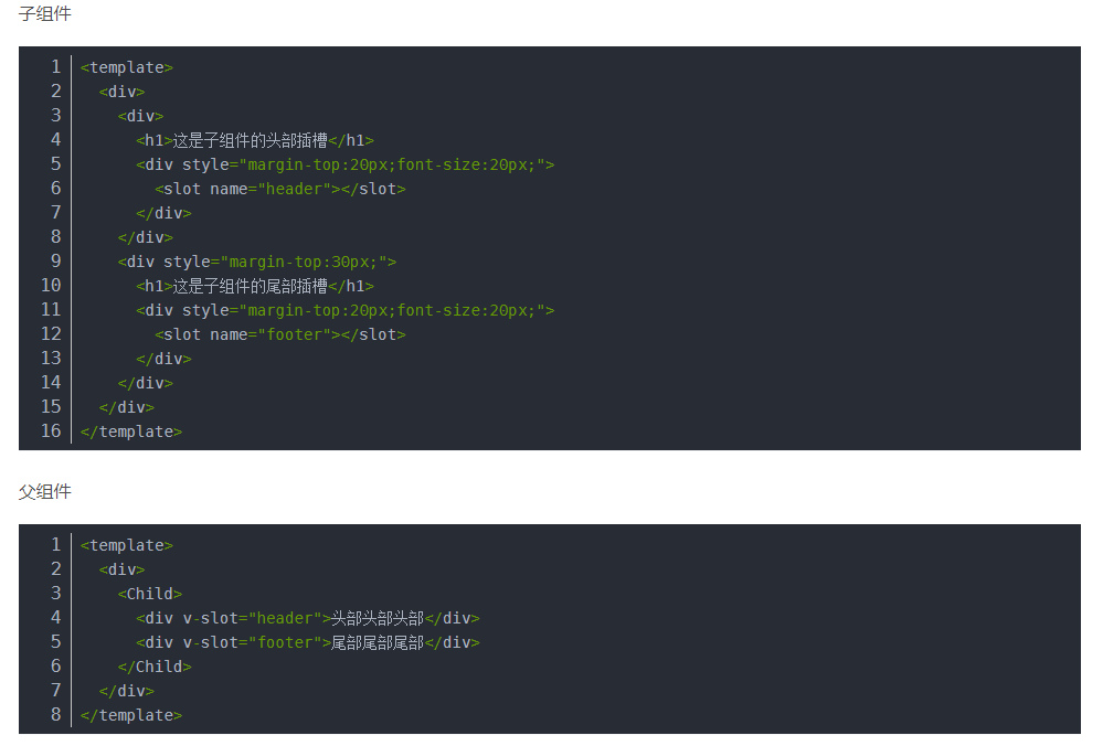 在父组件中使用子组件时,可能有不止一个地方使用插槽,这个时候就要使用具名插槽。如果不带名称的话,就不知道对应的是哪个地方。