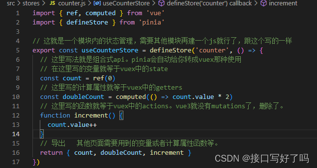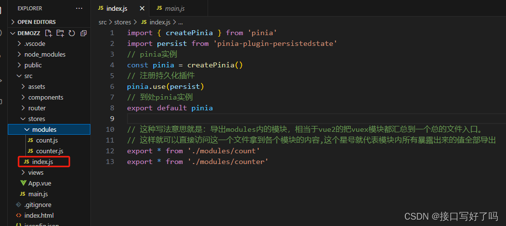 2,我们以后会有很多个的模块,当我们每个页面使用的时候都需要每个模块引入一次,这非常不方便。我们希望的是只引入一个文件,然后可以把多个模块都导出来。免得我们写多个路径说不定就写错了。所以这里就弄一个主入口文件,然后把这个文件到处pinia实例到main.js中注册就可以了。
