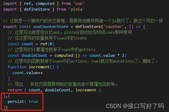 3,多个模块,如何选择某个模块持久化,只需要在对应模块内的defineStore函数第三个参数放一个persist参数就行了
