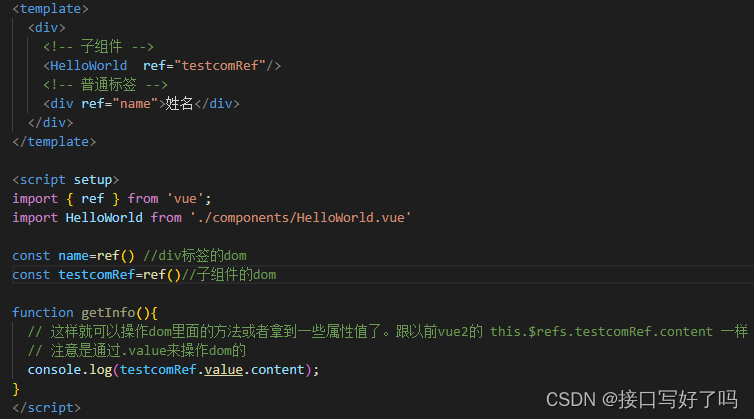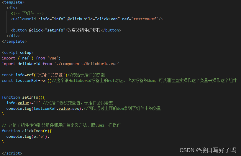 总体来说跟vue2的父子传值区别不是很大,就是换了一个接受发送方式,逻辑还是一样的。
