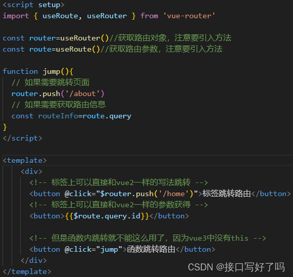 所以这里vue3新给了一个方法,如下图中的 useRouter 和 useRoute