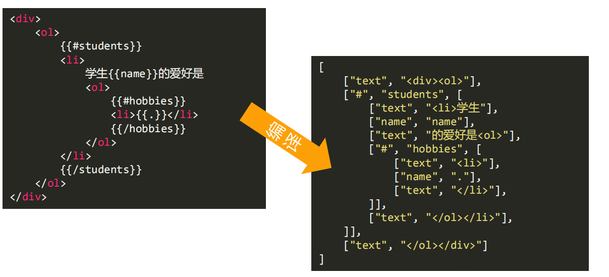 3.模板字符串到token中,采用#入栈 /出栈的思想,嵌套数组的children