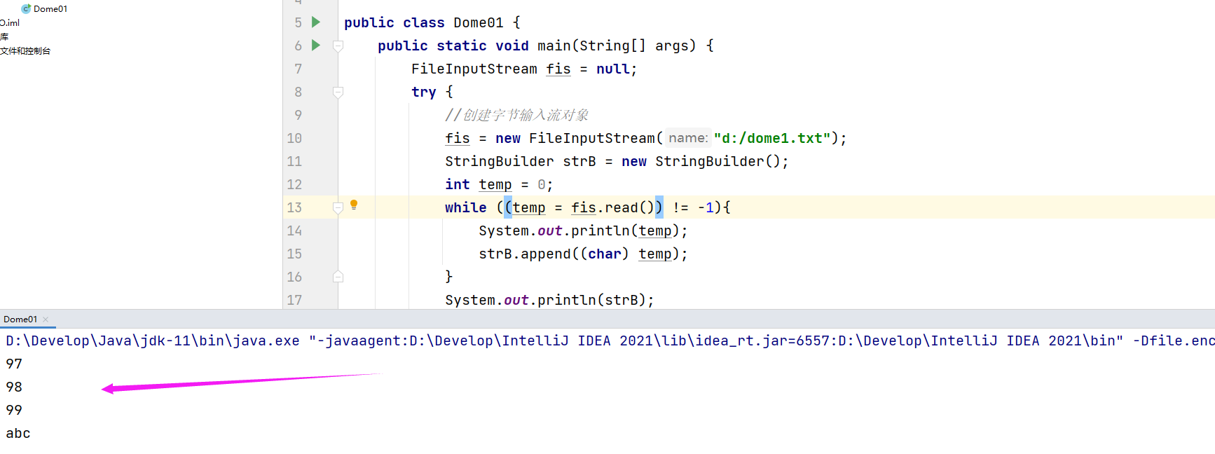 fis = new FileInputStream("d:/dome1.txt");