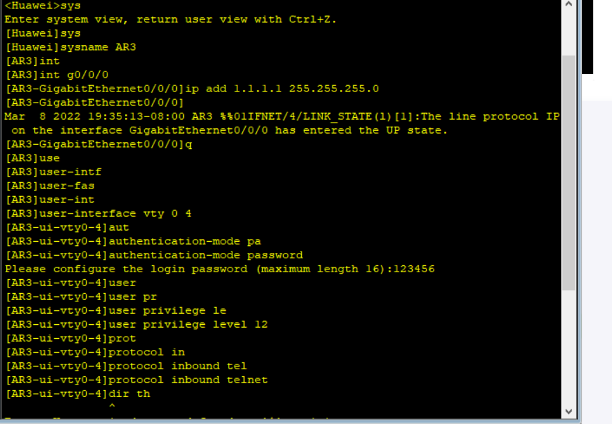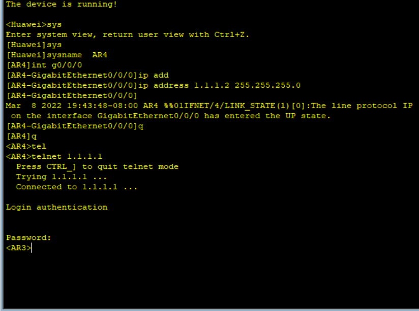 2.分别在AR3和AR4 上配置一个IP,在AR3上开启telnet服务,最后在AR4上进行telent远程访问。