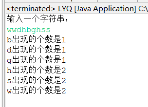 import java.util.*; public class LYQ { public static void main(String[] args) { System.out.println("输入一个字符串:"); Scanner reader = new Scanner(System.in); String s = reader.nextLine(); int []ss = new int[100]; for(int i=0;i<s.length();i++){ char ch = s.charAt(i); int k = ch-'a'; ss[k] = ss[k]+1; } for(int m = 0;m<ss.length;m++){ if(ss[m]!=0){ System.out.println((char)(m+'a')+"出现的个数是"+ss[m]); } } } }