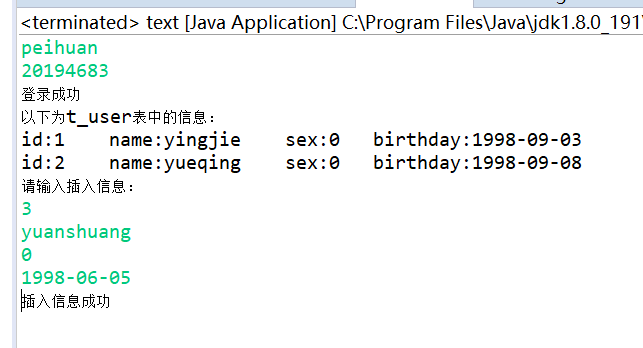 package llll; import java.sql.ResultSet; import java.sql.SQLException; import java.util.Scanner; import llll.DB; public class text{ public static void main(String[] args) { Scanner input=new Scanner(System.in); String username=input.next(); String password=input.next(); ResultSet o; ResultSet p; DB db = new DB(); o = db.executeSelect("select * from t_login where username = '"+username+"' and password = '"+password+"'", args); try { if (o.next()) { System.out.println("登录成功"); System.out.println("以下为t_user表中的信息:"); p = db.executeSelect("select * from t_user", args); while(p.next()) { int id = p.getInt(1); String name = p.getString(2); int sex = p.getInt(3); String birthday = p.getString(4); System.out.println("id:"+id+"\tname:"+name+"\tsex:"+sex+"\tbirthday:"+birthday); } System.out.println("请输入插入信息:"); int yy = input.nextInt(); String qq = input.next(); int tt = input.nextInt(); String uu = input.next(); String sql="insert into t_user(id,name,sex,birthday) values("+yy+",'"+qq+"',"+tt+",'"+uu+"')"; int n = db.executeModify(sql, args); if(n>0) { System.out.println("插入信息成功"); }else { System.out.println("插入信息失败"); } }else { System.out.println("登录失败"); } } catch (SQLException e) { e.printStackTrace(); } } }