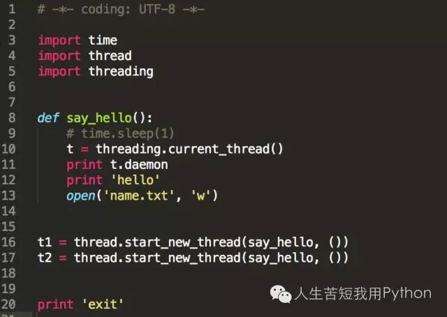 代码中我们可以看到,创建的线程输出的daemon是True。 可见问题2是说的不对的。 也就是说在主线程中用start_new_thread创建的线程其实是daemon=True的。这样就可以解释我们的主程序不会等待daemon程序执行完毕这个情况了。通过取消注释sleep语句,我们可以看到主程序执行完毕后其他线程也被销毁了。