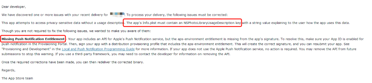 看邮件中的描述有两个问题,一个是关于访问用户隐私的问题,这个APP中会访问用户的相册,但在plist文件中没有描述;