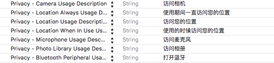 在plist文件里添加这几个字段(可以根据自己APP的情况,来添加,比如我用了蓝牙,就找到带有Bluetooth的字段),重点是:要在后面添加描述,如果不添加描述,跟没加是一样的,苹果还是会拒绝,我当时就犯了这个错误