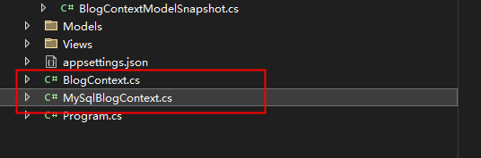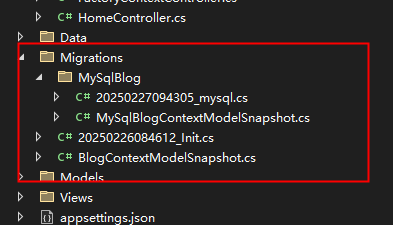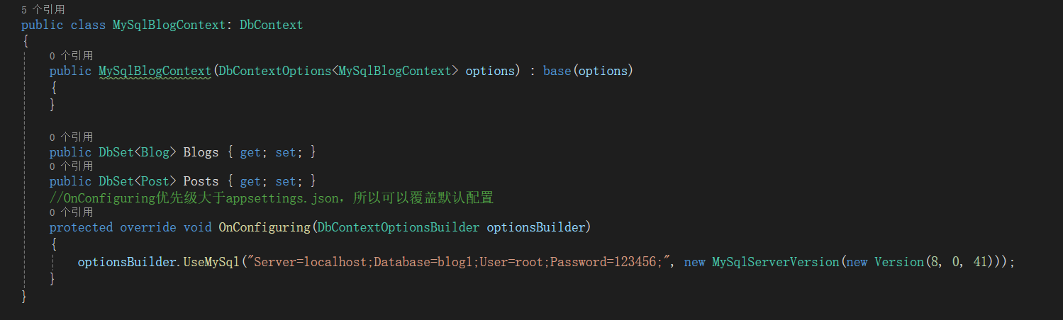 public class MySqlBlogContext: DbContext { public MySqlBlogContext(DbContextOptions<MySqlBlogContext> options) : base(options) { } public DbSet<Blog> Blogs { get; set; } public DbSet<Post> Posts { get; set; } //OnConfiguring优先级大于appsettings.json,所以可以覆盖默认配置 protected override void OnConfiguring(DbContextOptionsBuilder optionsBuilder) { optionsBuilder.UseMySql("Server=localhost;Database=blog1;User=root;Password=123456;", new MySqlServerVersion(new Version(8, 0, 41))); } }