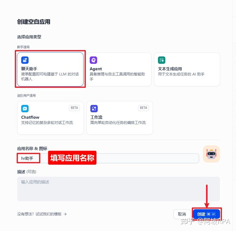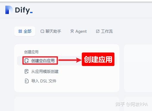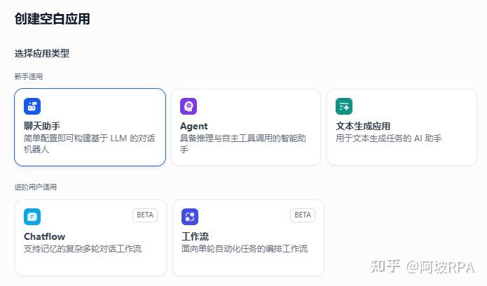从创建应用页面可以看到,他可以创建:聊天助手,Agent,文生文应用,对话工作流,任务编排工作流等