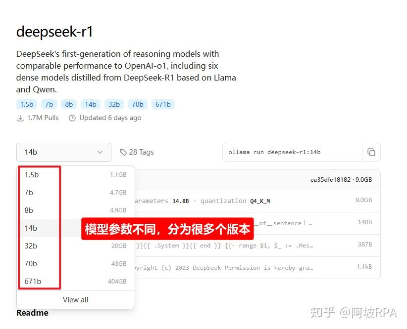 可以看到模型有根据参数分为1.5b,7b,8b,14b,32b,70b,671b等,我们需要根据自己电脑选择下载对应参数的模型。