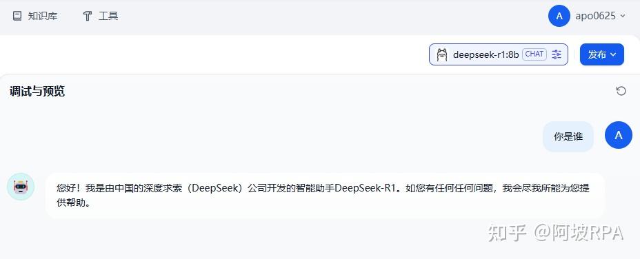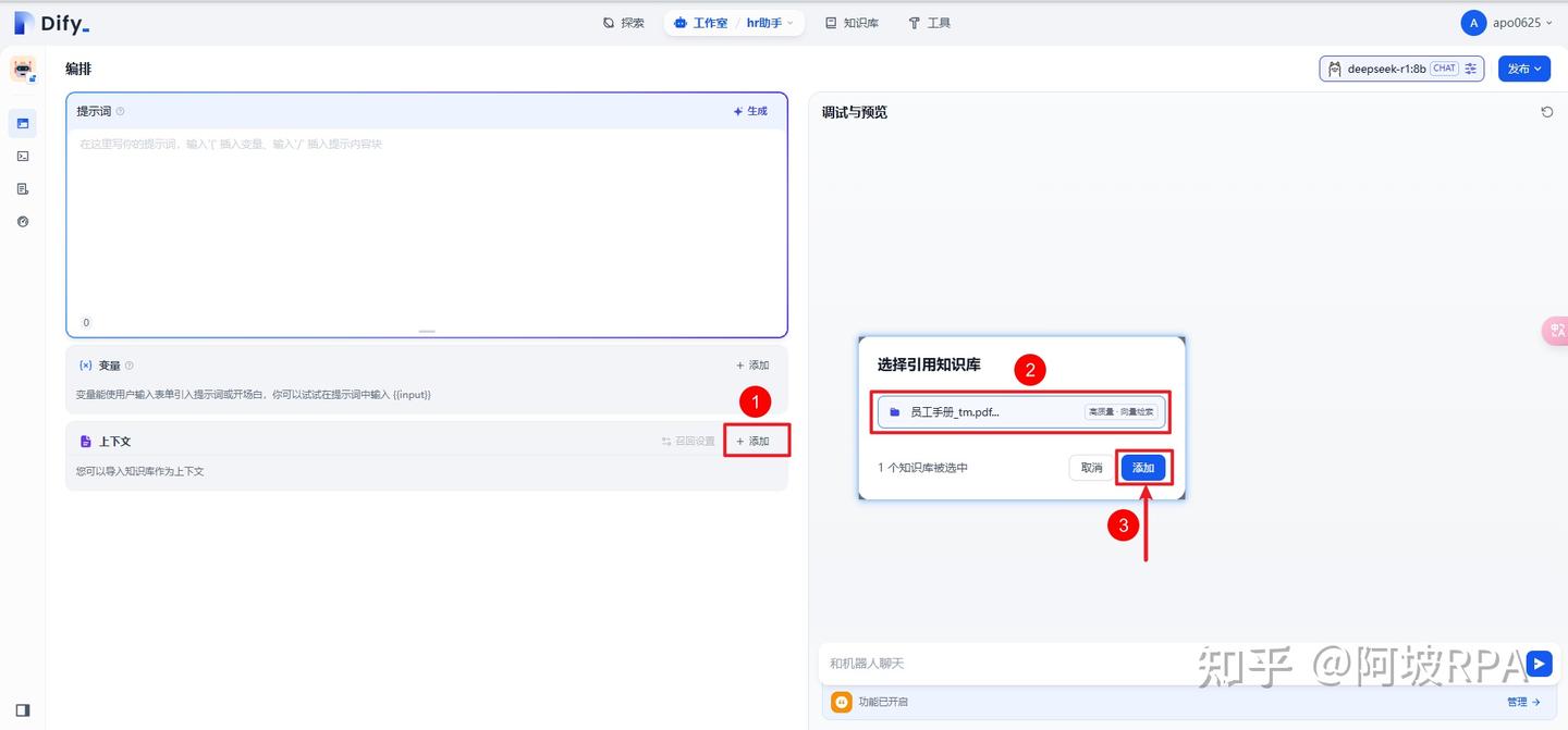 这表明,dify与本地部署的大模型deepseek-r1连通了,但是,我想让他的回答是基于我的私有知识库作为上下文来和我聊天怎么办?这就需要用到本地知识库了