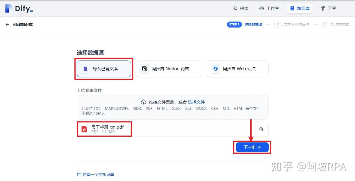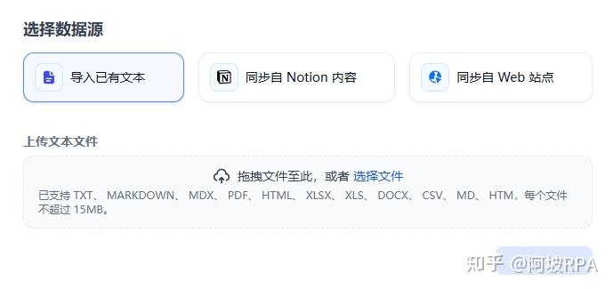 他也支持从已有文本,Notion,网页等数据源创建知识库: