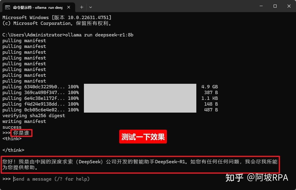 安装完成后,会自动运行大模型,我们输入一个问题测试一下: