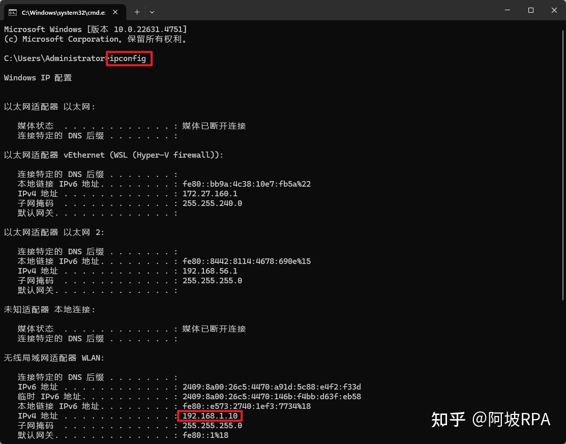 在命令行输入:ipconfig,并找到当前连接的网络适配器(如“无线局域网适配器 WLAN”或“以太网适配器”),下方显示的 IPv4 地址