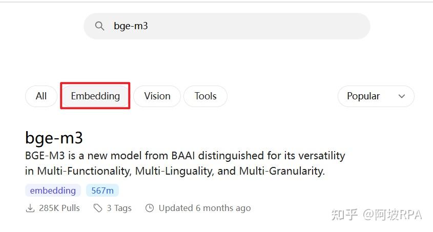BGE (BAAI General Embedding) 专注于检索增强llm领域,经本人测试,对中文场景支持效果更好,当然也有很多其他embedding模型可供选择,可以根据自己的场景,在ollama上搜索“embedding”查询适合自己的嵌入模型。