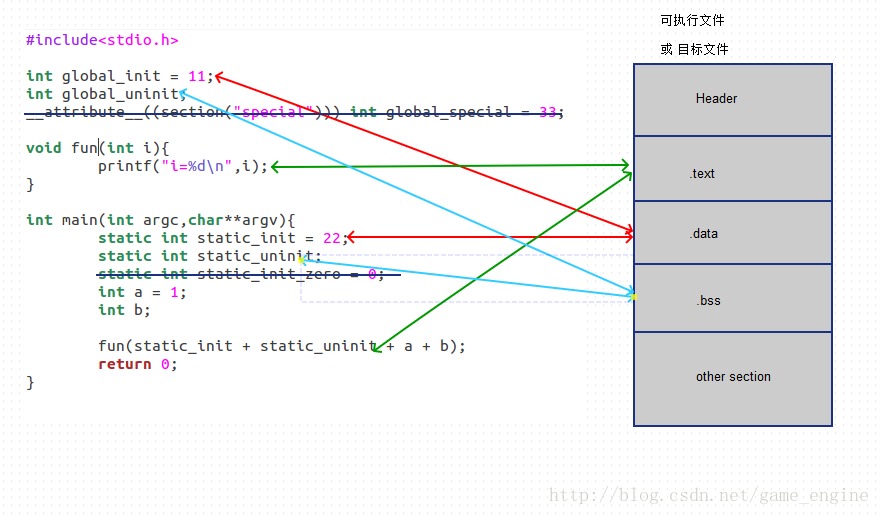 程序源代码编译之后(注意是只编译,不链接),程序的指令会放在代码段,初始化了的全局变量和局部静态变量会放在数据段,未初始化的全局变量和局部静态变量