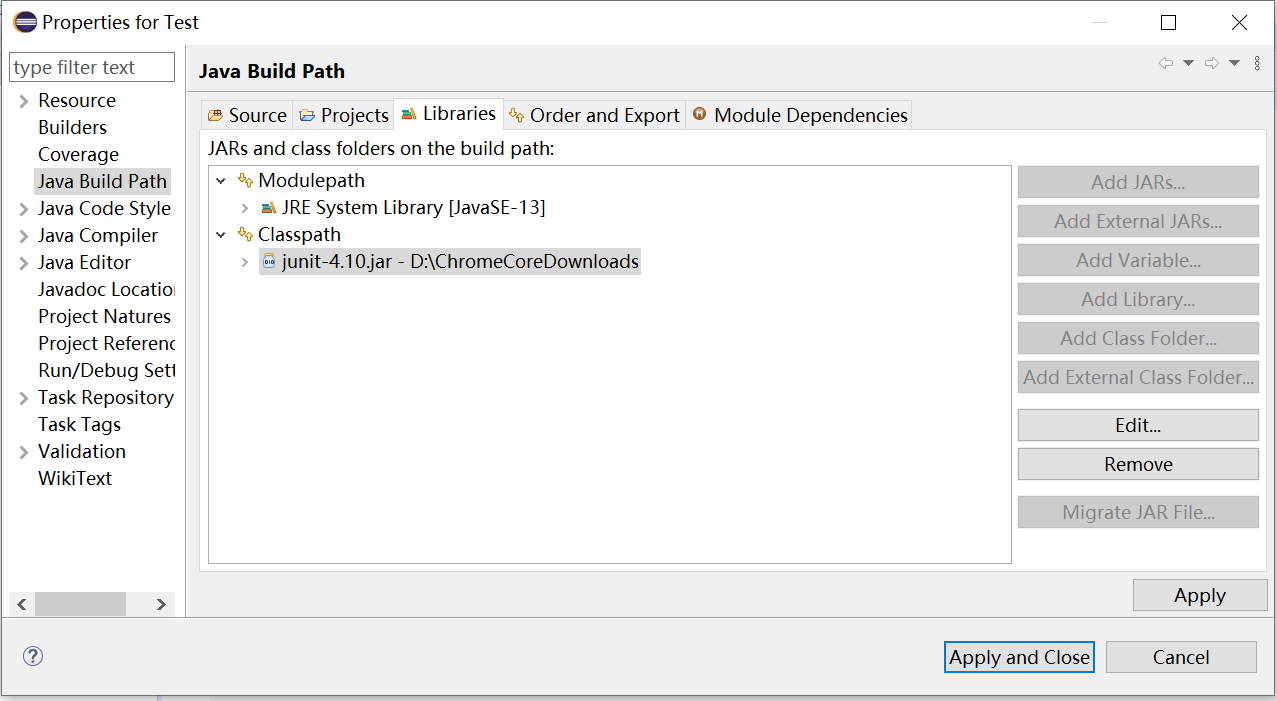 打开eclise - > 右击peoject 然后点击property >Build Path >Configure Build path ,然后在Libraries中的Classpath中点击Add External Jar 添加junit-4.10.jar 然后Apply即可