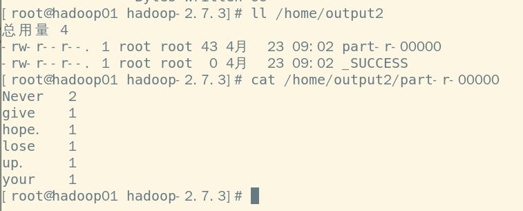 查看自动创建的output2目录 命令:[root@hadoop01 hadoop-2.7.3]# ll /home/output2