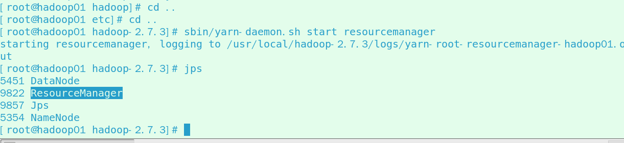 命令:[root@hadoop01 hadoop-2.7.3]# sbin/yarn-daemon.sh start resourcemanager