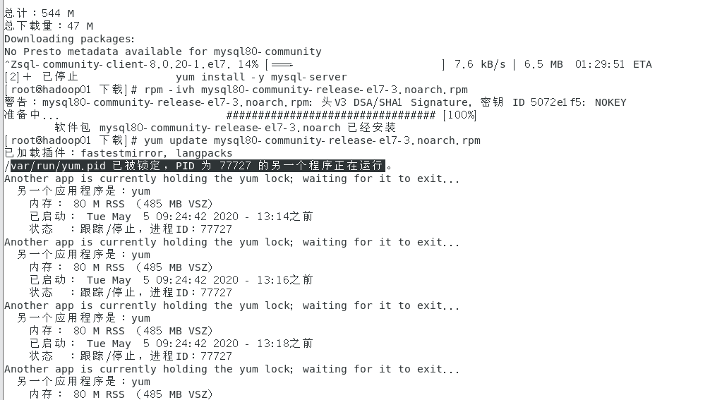 问题1:下载MySQL过程中若出现/var/run/yum.pid 已被锁定,PID 为xxx的另一个程序正在运行的问题.如下图: