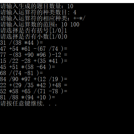 运行结果1:生成10道题,含有+-/四种运算,运算数范围10到100,运算数为整数且有括号,不打印到文件。