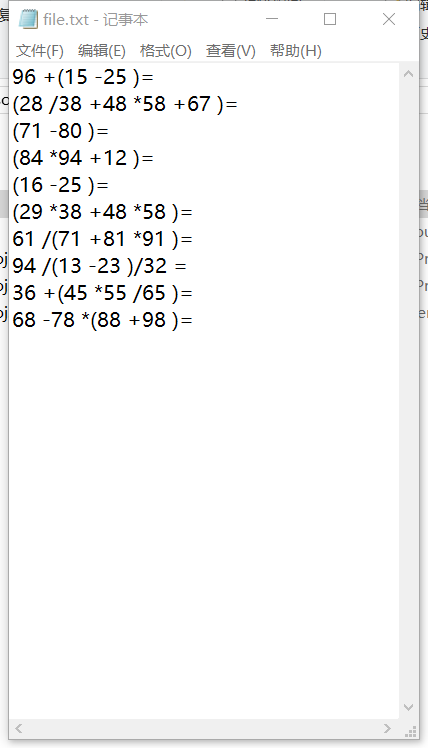 运行结果1:生成10道题,含有+-/四种运算,运算数范围10到100,运算数为整数且有括号,打印到文件。
