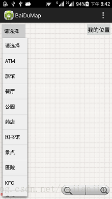 package com.majianjie.baidumap; import java.util.ArrayList; import java.util.List; import android.app.Activity; import android.app.AlertDialog; import android.content.DialogInterface; import android.graphics.Bitmap; import android.graphics.drawable.Drawable; import android.os.Bundle; import android.view.LayoutInflater; import android.view.Menu; import android.view.MenuItem; import android.view.View; import android.view.View.MeasureSpec; import android.view.Window; import android.widget.AdapterView; import android.widget.AdapterView.OnItemSelectedListener; import android.widget.ArrayAdapter; import android.widget.Button; import android.widget.ImageView; import android.widget.Spinner; import android.widget.TextView; import android.widget.Toast; import com.baidu.location.BDLocation; import com.baidu.location.BDLocationListener; import com.baidu.location.LocationClient; import com.baidu.location.LocationClientOption; import com.baidu.mapapi.BMapManager; import com.baidu.mapapi.MKGeneralListener; import com.baidu.mapapi.map.LocationData; import com.baidu.mapapi.map.MKEvent; import com.baidu.mapapi.map.MKMapViewListener; import com.baidu.mapapi.map.MapController; import com.baidu.mapapi.map.MapPoi; import com.baidu.mapapi.map.MapView; import com.baidu.mapapi.map.MyLocationOverlay; import com.baidu.mapapi.map.PoiOverlay; import com.baidu.mapapi.map.PopupClickListener; import com.baidu.mapapi.map.PopupOverlay; import com.baidu.mapapi.search.MKAddrInfo; import com.baidu.mapapi.search.MKBusLineResult; import com.baidu.mapapi.search.MKDrivingRouteResult; import com.baidu.mapapi.search.MKPoiInfo; import com.baidu.mapapi.search.MKPoiResult; import com.baidu.mapapi.search.MKSearch; import com.baidu.mapapi.search.MKSearchListener; import com.baidu.mapapi.search.MKShareUrlResult; import com.baidu.mapapi.search.MKSuggestionResult; import com.baidu.mapapi.search.MKTransitRouteResult; import com.baidu.mapapi.search.MKWalkingRouteResult; import com.baidu.platform.comapi.basestruct.GeoPoint; import com.example.baidumap.R; public class MainActivity extends Activity { //声明控件 private Button request; private static StringBuilder sb = new StringBuilder(); private int i=1; private Toast mToast=null; private BMapManager mBMapManager=null; private MapView mMapView = null; //MapView 是地图主控件 private MapController mMapController = null;//用MapController完毕地图控制 private LocationClient mLocClient; public LocationData mLocData = null; private LocationOverlay myLocationOverlay = null;//定位图层 private boolean isRequest = false;//是否手动触发请求定位 private boolean isFirstLoc = true;//是否首次定位 private PopupOverlay mPopupOverlay = null;//弹出泡泡图层。浏览节点时使用 private View viewCache=null; public BDLocation location = new BDLocation(); <span style="color:#ff6666;"> //POI private MKSearch mMKSearch = null; private Spinner detail; private List<String> poi; private ArrayAdapter< String> adapter; private String poiName="";</span> @Override protected void onCreate(Bundle savedInstanceState) { super.onCreate(savedInstanceState); //**使用地图sdk前需先初始化BMapManager。这个必须在setContentView()先初始化 mBMapManager = new BMapManager(this); //第一个參数是API key, 第二个參数是经常使用事件监听,用来处理通常的网络错误,授权验证错误等,你也能够不加入这个回调接口 mBMapManager.init("LDtH1sVwr7kygaF0aTqaVwWU", new MKGeneralListener() { //授权错误的时候调用的回调函数 @Override public void onGetPermissionState(int iError) { if (iError == MKEvent.ERROR_PERMISSION_DENIED) { showToast("API KEY错误, 请检查!"); } } //一些网络状态的错误处理回调函数 @Override public void onGetNetworkState(int iError) { if (iError == MKEvent.ERROR_NETWORK_CONNECT) { Toast.makeText(getApplication(), "您的网络出错啦!", Toast.LENGTH_LONG).show(); } } }); //初始化 init(); //单击事件 click(); } //* 显示Toast消息 private void showToast(String msg){ if(mToast == null){ mToast = Toast.makeText(this, msg, Toast.LENGTH_SHORT); }else{ mToast.setText(msg); mToast.setDuration(Toast.LENGTH_SHORT); } mToast.show(); } private void click() { request.setOnClickListener(new View.OnClickListener() { @Override public void onClick(View arg0) { requestLocation(); } }); } @Override protected void onResume() { //MapView的生命周期与Activity同步。当activity挂起时需调用MapView.onPause() mMapView.onResume(); mBMapManager.start();//又一次启动 mMKSearch.init(mBMapManager, new MySearchListener()); super.onResume(); } @Override protected void onPause() { //MapView的生命周期与Activity同步,当activity挂起时需调用MapView.onPause() mMapView.onPause(); super.onPause(); } private void init() { //使用自定义的title,注意顺序 setContentView(R.layout.activity_main); //activity的布局 //这里是加入自定义的titlebtn.xml //通过id找到他们 mMapView = (com.baidu.mapapi.map.MapView) findViewById(R.id.bmapView); mMapController=mMapView.getController(); //获取地图控制器 mMapController.enableClick(true); //设置地图是否响应点击事件 request=(Button)findViewById(R.id.request); viewCache = LayoutInflater.from(this).inflate(R.layout.pop_layout, null); mPopupOverlay= new PopupOverlay(mMapView, new PopupClickListener() {// * 点击弹出窗体图层回调的方法 @Override public void onClickedPopup(int arg0) { //隐藏弹出窗体图层 mPopupOverlay.hidePop(); } }); mMapController.enableClick(true); //* 设置地图是否响应点击事件 . mMapController.setZoom(12); // * 设置地图缩放级别 mMapView.setBuiltInZoomControls(true); // * 显示内置缩放控件 mMapView.setTraffic(true); <span style="color:#ff6666;"> //poi mMKSearch = new MKSearch(); detail=(Spinner)findViewById(R.id.detail); poi = new ArrayList<String>(); poi.add("请选择"); poi.add("ATM"); poi.add("旅馆"); poi.add("餐厅"); poi.add("公园"); poi.add("药店"); poi.add("图