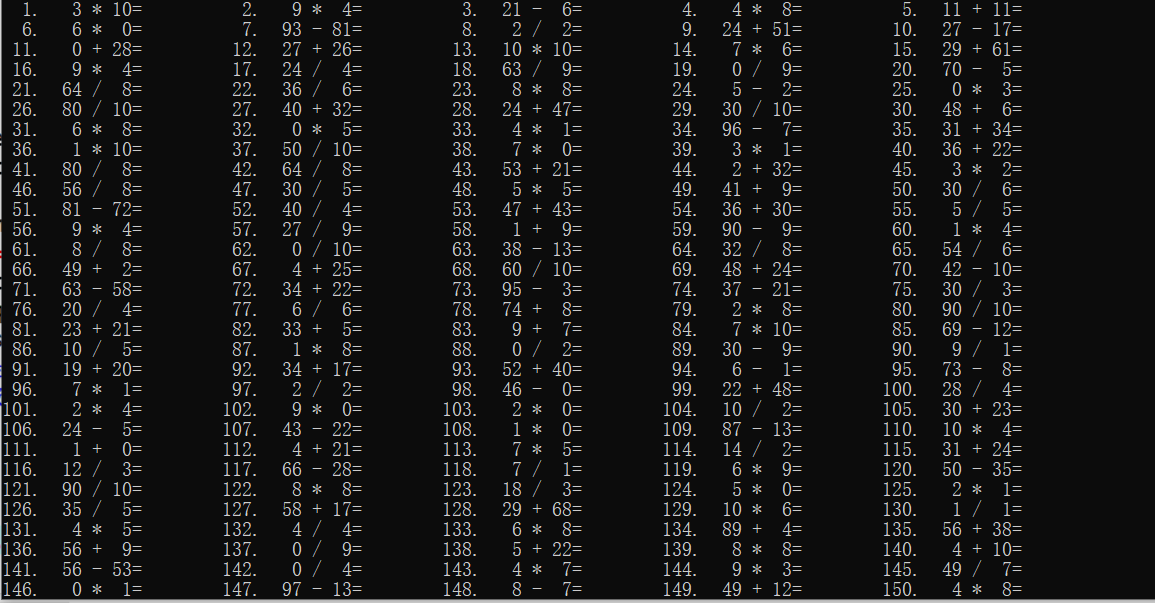 #include <iomanip> #include <iostream> #include <ctime> #include <cstdlib> using namespace std; int num1[300]; int num2[300]; int op[300]; int answer[300]; int real[300]; void srand(unsigned int seed); int getRand(int min, int max); void get_question(int num1[],int num2[],int op[],int real[]) //数组随机填充函数 { for(int i = 1;i<=300;i++){ op[i]=getRand(0,3); //随机生成运算符 } for(int j = 1;j<=300;j++){ if (op[j] == 0){ real[j]=getRand(0,100); num2[j]=getRand(0,real[j]); num1[j]=real[j]-num2[j]; } else if(op[j] == 1){ num1[j]=getRand(0,100); num2[j]=getRand(0,num1[j]); real[j]=num1[j]-num2[j]; } else if(op[j] == 2) { num1[j]=getRand(0,10); num2[j]=getRand(0,10); real[j]=num1[j]*num2[j]; } else{ real[j]=getRand(0,10); num2[j]=getRand(1,10); num1[j]=real[j]*num2[j]; } } } int getRand(int min, int max) { //随机数生成函数 return ( rand() % (max - min + 1) ) + min ; } void display_question(int num1[],int num2[],int op[],int real[]){ //题目输出函数 for(int i = 1;i<=300;i++){ switch(op[i]){ case 0: cout<<setw(3)<<i<<". "<<setw(3)<<num1[i]<<" +"<<setw(3)<<num2[i]<<'='<<setw(8)<<" "; break; case 1: cout<<setw(3)<<i<<". "<<setw(3)<<num1[i]<<" -"<<setw(3)<<num2[i]<<'='<<setw(8)<<" "; break; case 2: cout<<setw(3)<<i<<". "<<setw(3)<<num1[i]<<" *"<<setw(3)<<num2[i]<<'='<<setw(8)<<" "; break; case 3: cout<<setw(3)<<i<<". "<<setw(3)<<num1[i]<<" /"<<setw(3)<<num2[i]<<'='<<setw(8)<<" "; break; } if (i%5==0) cout<<endl; } } void check_answer(int answer,int real[],int right){ //答案检查函数 for(int i = 1;i<=300;i++){ //为方便演示可把此处的i改为小数字 cout<<"请输入第"<<i<<"题的答案"<<endl; cin>>answer; if(answer==real[i]){ right++; cout<<"正确!"<<endl; } else cout<<"错误!"<<endl; } right=right/3; cout<<"答题结束,你的分数是:"<<right<<endl; } int main (){ int answer; int right=0; int i=0; srand(time(NULL)); while(i==0){ get_question( num1,num2, op, real); display_question( num1,num2, op, real); check_answer(answer, real,right); cout<<"是否再来一组?(输入0)"<<endl; cout<<"按任意键退出。。。"<<endl; cin>>i; } return 0; }