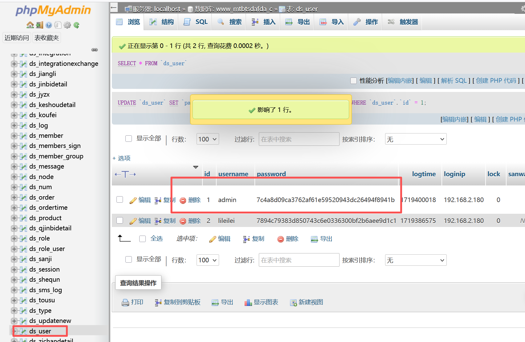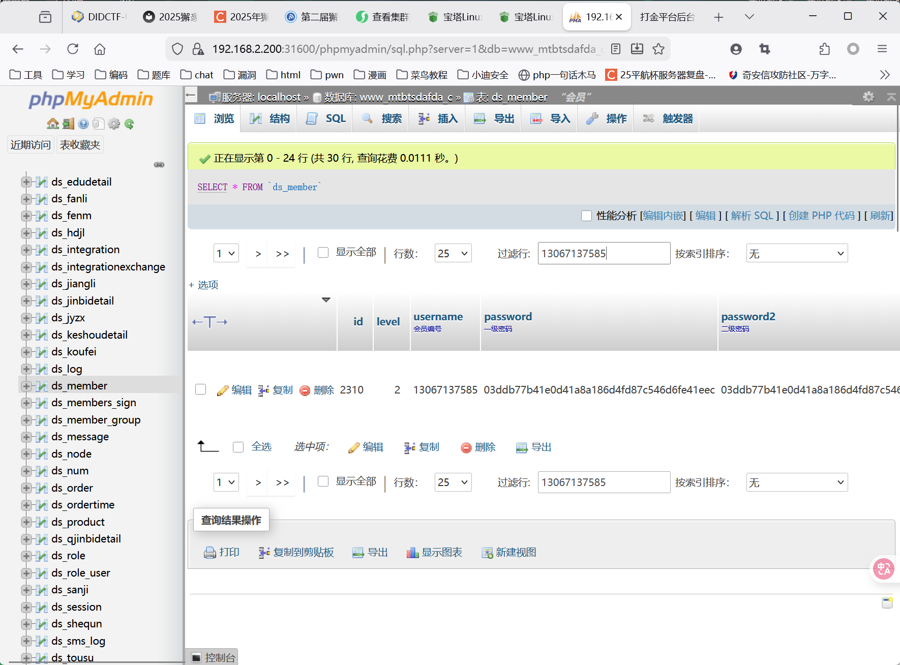 在宝塔的数据库管理页面可以直接进去该网站的数据库,搜索用户手机号