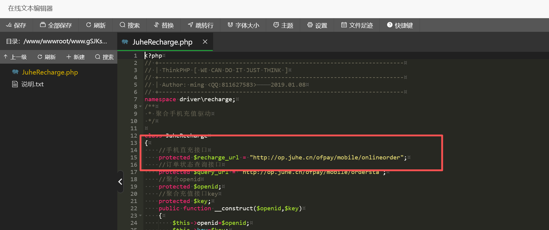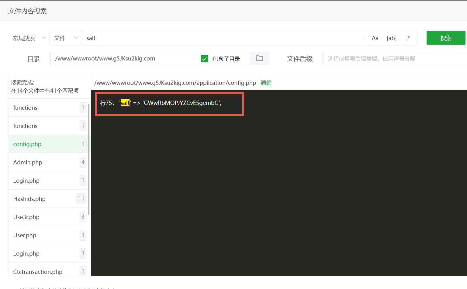 进网站目录看看,在/www/wwwroot/www.gSJKsu2kig.com/application/api目录下的config.php文件内看到