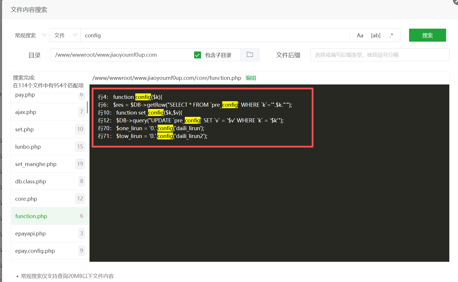 找一下config函数,在function.php中看到了定义config函数
